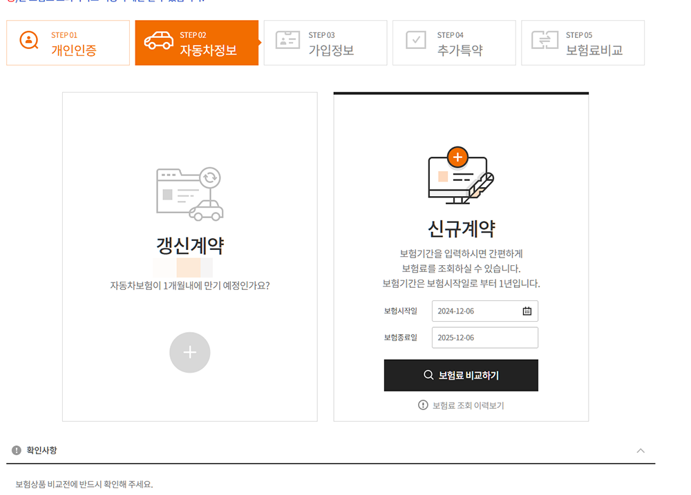 - 계약 유형 선택: 기존 보험이 있다면 '갱신 계약', 없으면 '신규 계약'을 선택합니다.