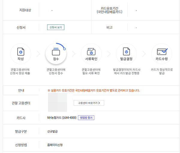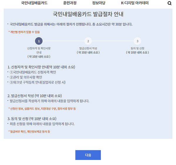 - 내일배움카드 신청 클릭 후 절차 진행: 주의사항 등을 꼼꼼히 읽어보시고 진행하십시오. 카드 신청이 완료되면 주소지로 카드를 수령할 수 있습니다.